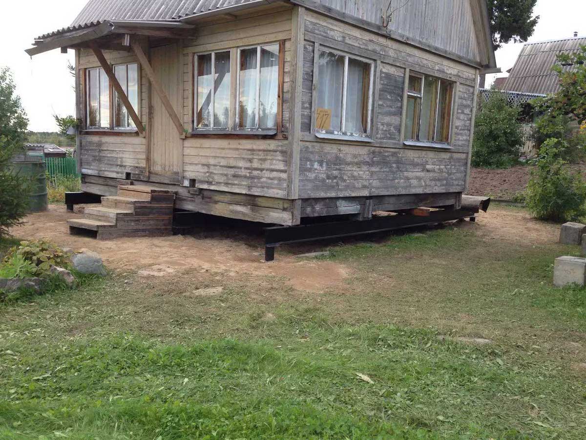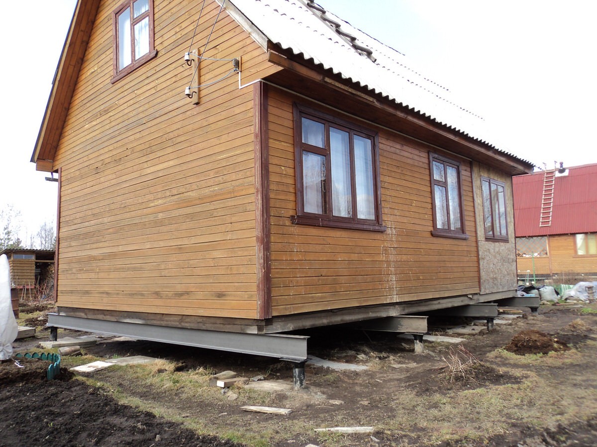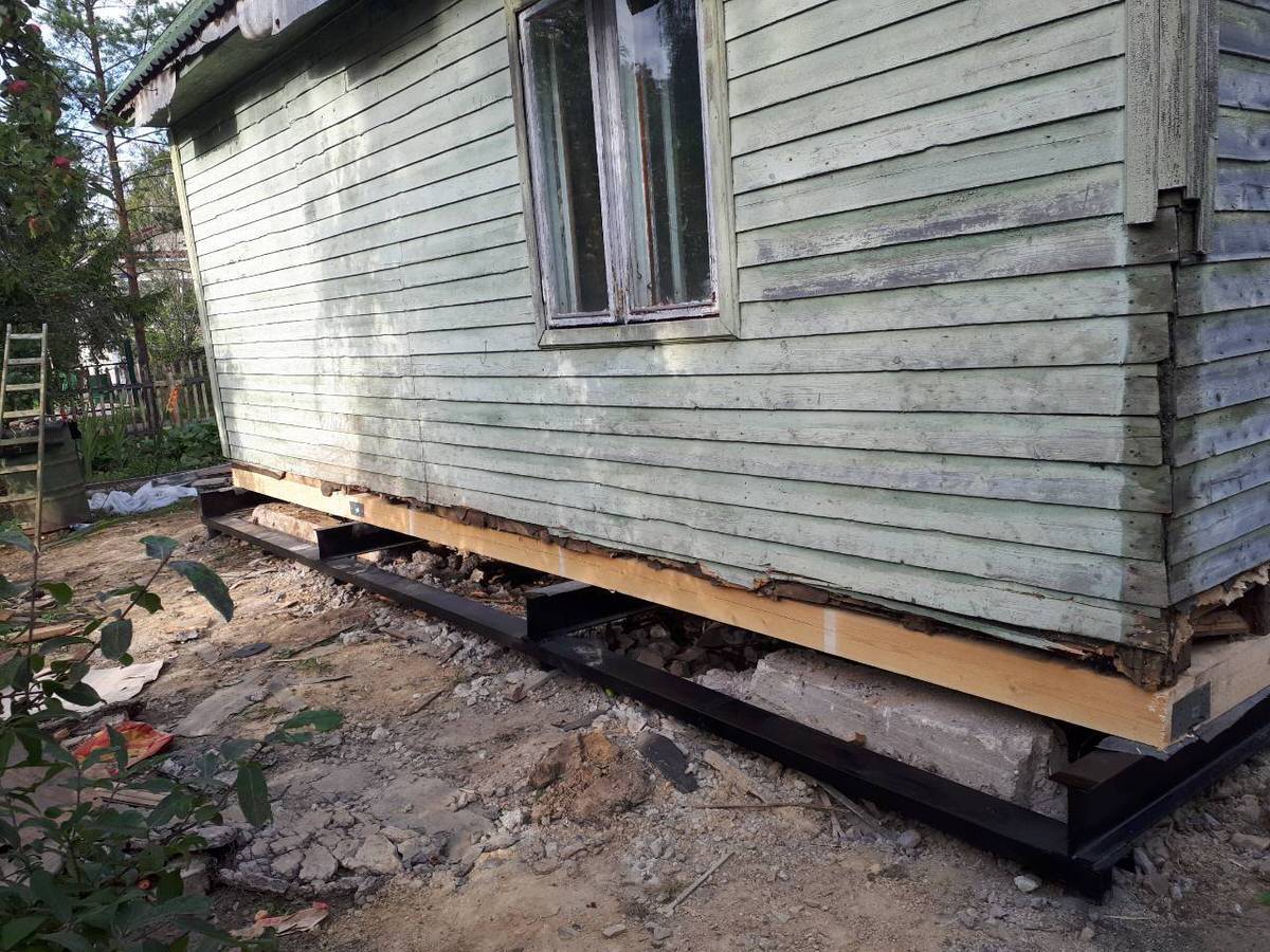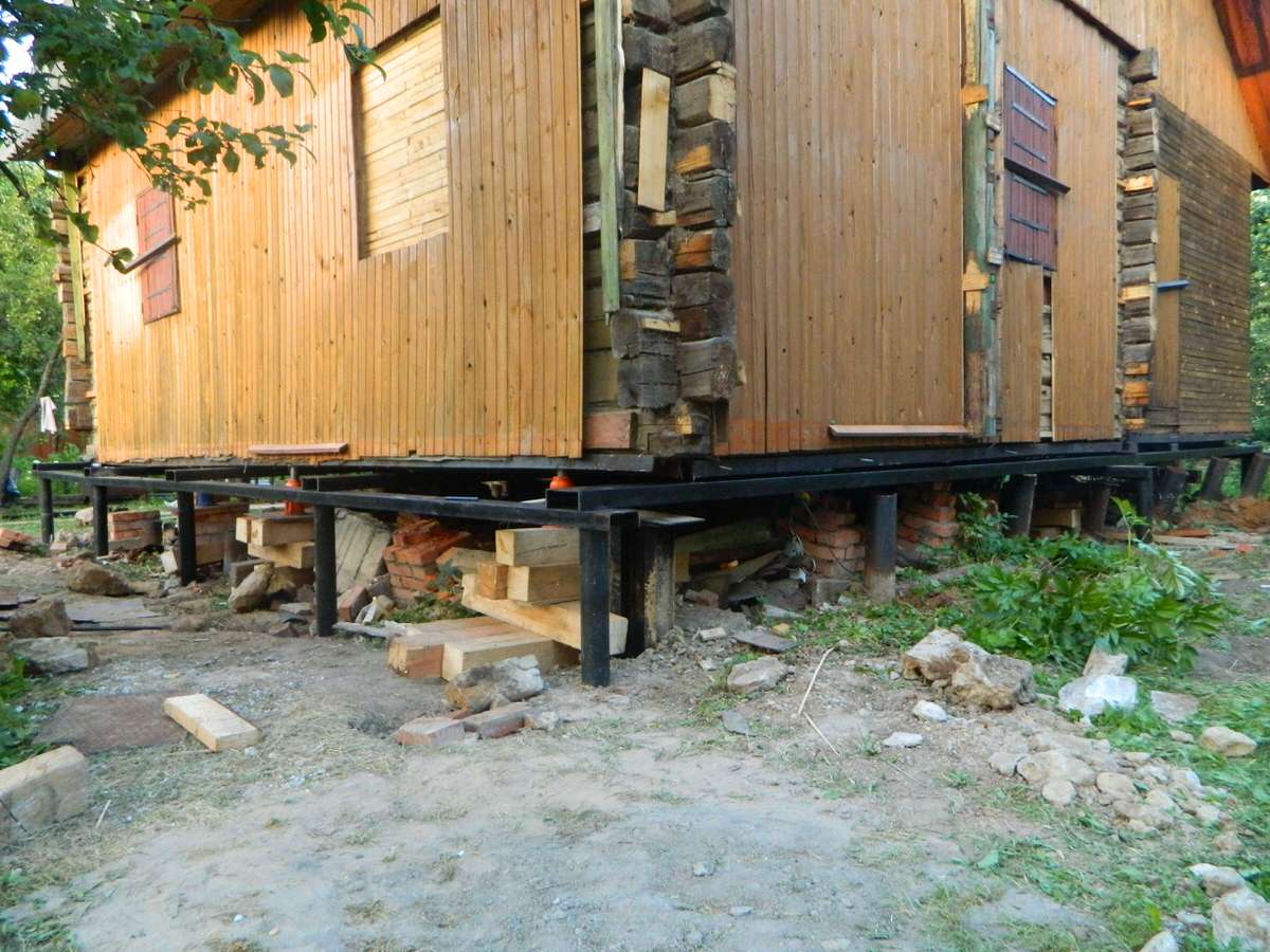 Установка свай. Монтируем сваи нужного типоразмера, делаем обвязку швеллером или двутавровой балкой. После завершения работы дом опускается на новое основание.
