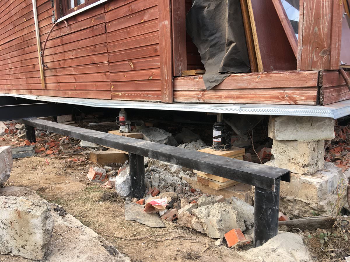 Подъем дома. Постройку поднимают на домкратах на высоту 50-100 мм, старый фундамент дома частично демонтируют.