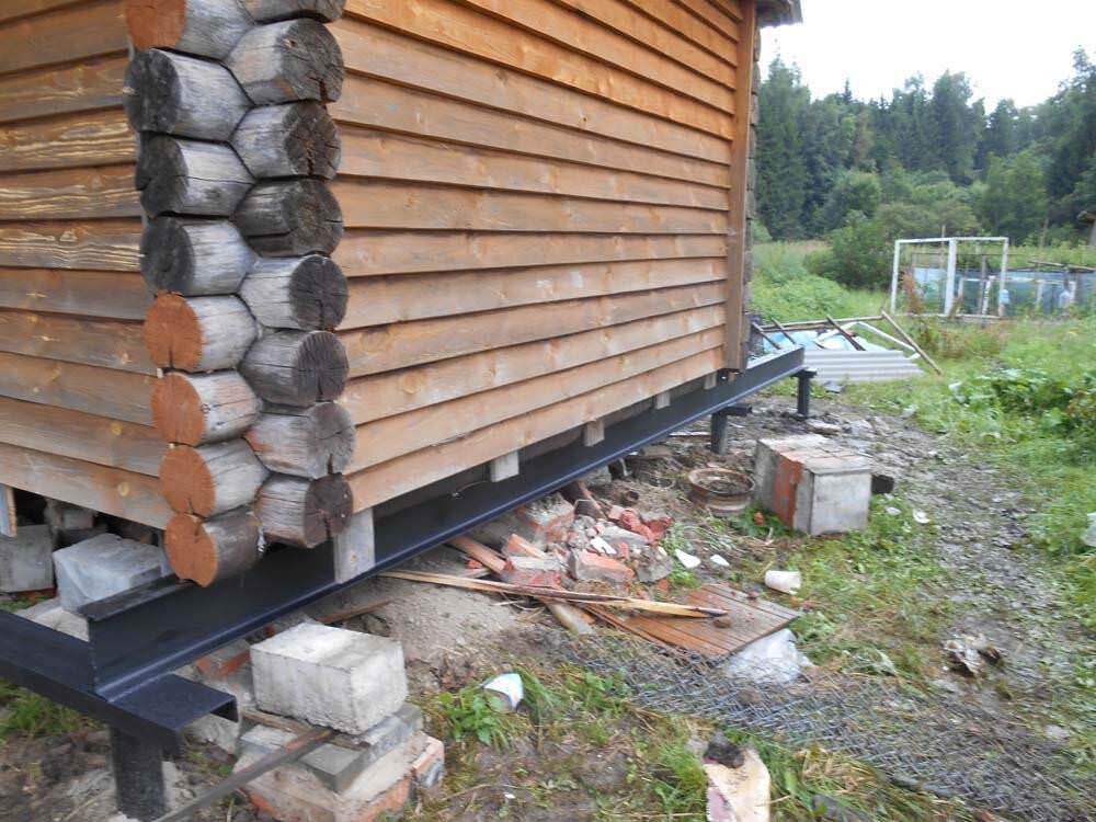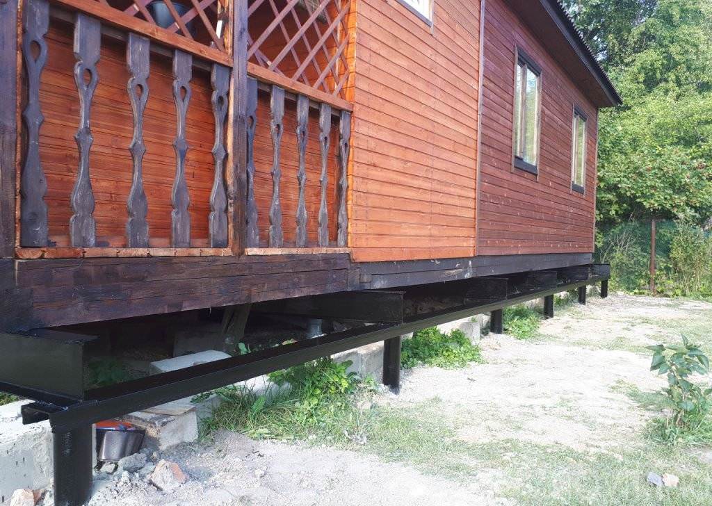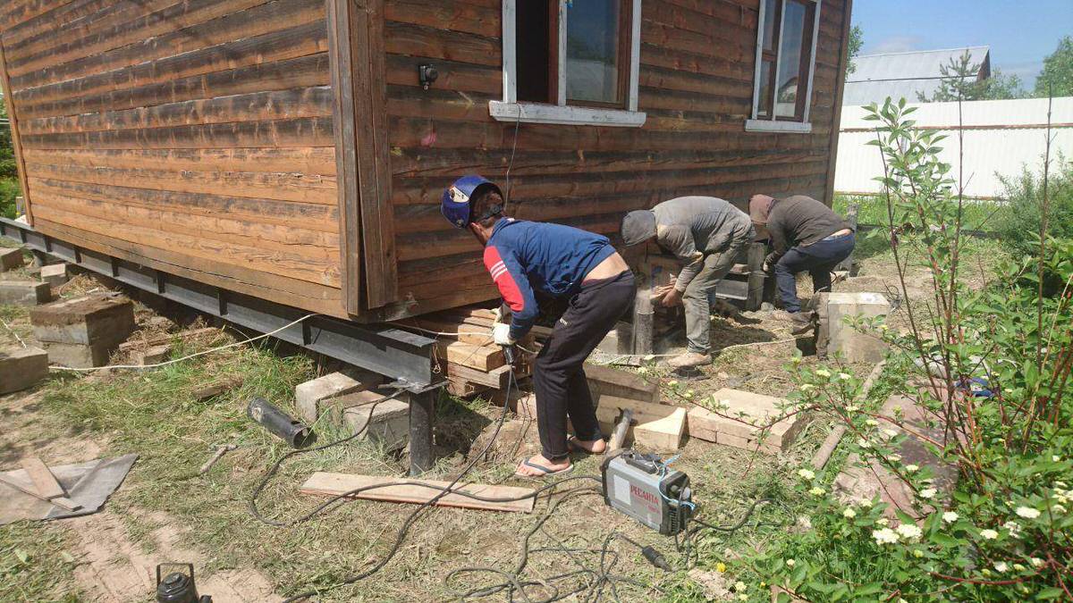 Подъем дома. Здание поднимают при помощи домкратов, фиксируют стены и углы.